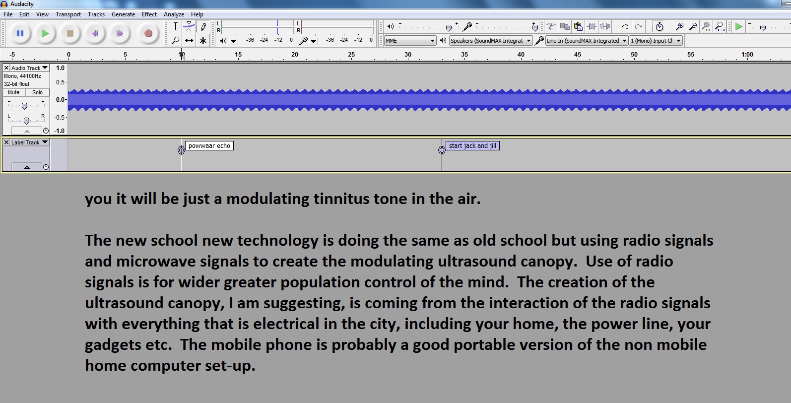If you use a vibrating thumper speaker on the walls of your home to make the walls of your home the speaker and generate a modulating hum as speech when you hear it it will sound and feel like it was your own thinking. Better still if it comes in silent sound vibrating hum and unheard, the ears will pick it up and the brain will process it and then make you think it like it was your own thinking but really it is an external rogue signal that has got into your brain and you think it is your own. There are symptoms if this is in your home: tinnitus sounds that will sound like it is modulating in the high pitch side of the spectrum or on the low pitch side you find an almost inaudible hum and pressure in your ears and sometimes a tingling in the ears that can come from this low pitch hum. You can sometimes find this when you sit at the back of a bus near where the engine is and if the vibration is right you will get this tingling in the ears from resonance if the hairs in your ears.