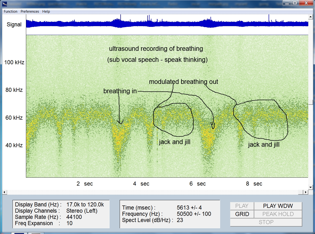 Ultrasound recording of “speak thinking” modulated breathing via nostrils using ultrasound microphones.