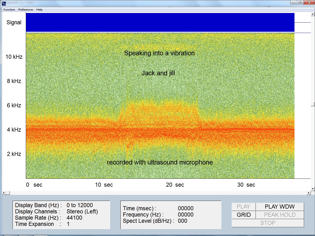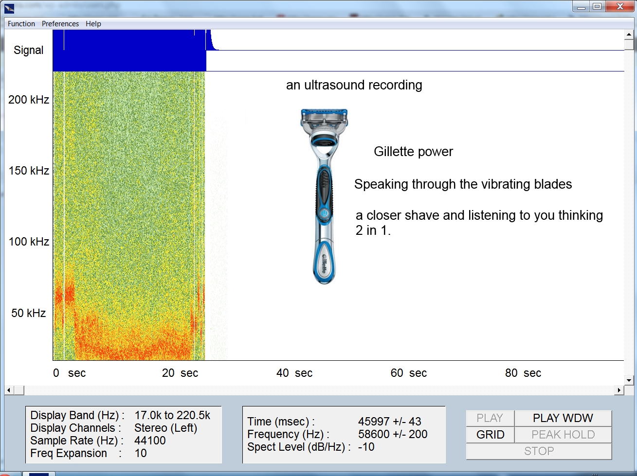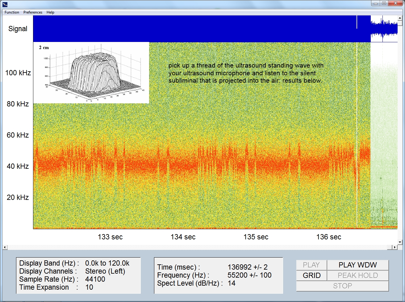 ultrasound subliminal projection into air using an ultrasound speaker. With normal hearing the subliminal is unheard. Recorded with ultrasound microphone.
