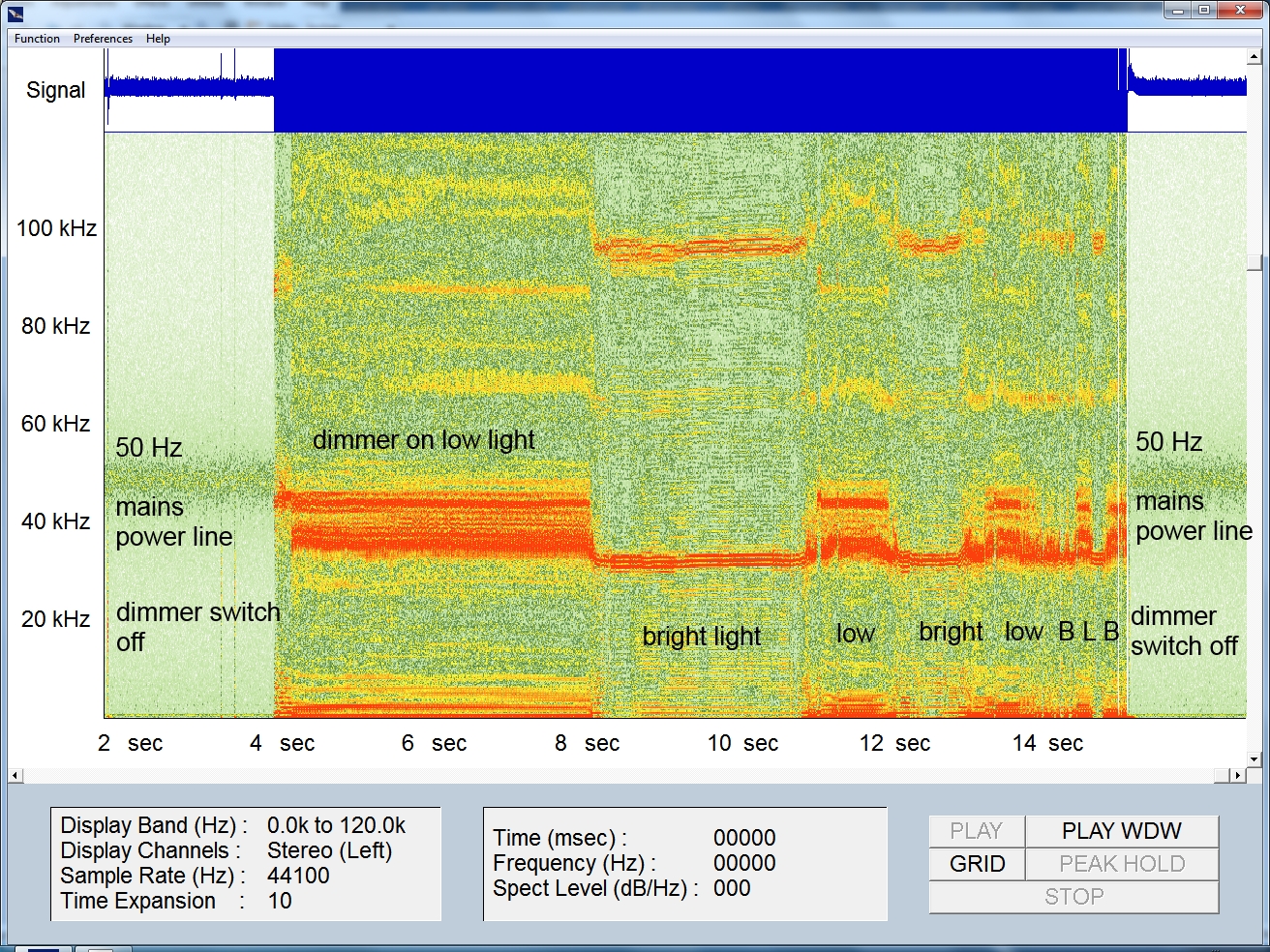 Light bulb with dimmer switch ultrasound recording using ultrasound microphone.