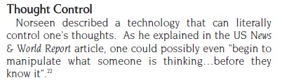 Thought reading: Thought reading can be classed as a form of “through wall surveillance” technology. In the unclassified and commercial realms, it is called thru-skull microwave reading, and magnetic skull-proximity reading.
