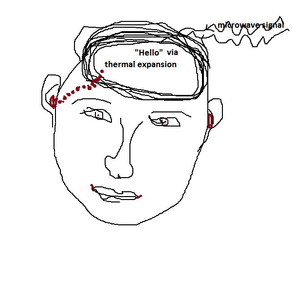 This is something I cannot duplicate or reproduce because it is a direct contact with the mind. It is all about controlling your thinking. In fact it is about making you think about things that has nothing to do with you. It involves a pulsed microwave signal that will go pass your skull and micro vibrate your brain. The modulation is then passed to the cochlea which then goes through the process of normal hearing. It will create words in your head according to the modulation and you would think it was your own thoughts. The only symptom is a tinnitus buzz in your head and if need be perhaps a word or 2.