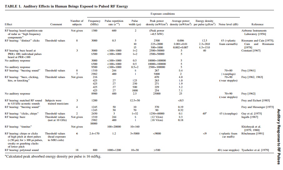 The human auditory response to pulses of radiofrequency (RF) energy, commonly called RF hearing, is a well established phenomenon. RF induced sounds can be characterized as low intensity sounds because, in general, a quiet environment is required for the auditory response. The sound is similar to other common sounds such as a click, buzz, hiss, knock, or chirp. Effective radiofrequencies range from 2.4 to 10 000 MHz, but an individual’s ability to hear RF induced sounds is dependent upon high frequency acoustic hearing in the kHz range above about 5 kHz. The site of conversion of RF energy to acoustic energy is within or peripheral to the cochlea, and once the cochlea is stimulated, the detection of RF induced sounds in humans and RF induced auditory responses in animals is similar to acoustic sound detection. ………….RF induced sounds involve the perception via bone conduction of thermally generated sound transients, that is, audible sounds are produced by rapid thermal expansion resulting from a calculated temperature rise of only 5 × 10−6 °C in tissue at the threshold level due to absorption of the energy in the RF pulse.Please read the conclusion in the full pdf version of the article.You can download it for free from the link above as in:
