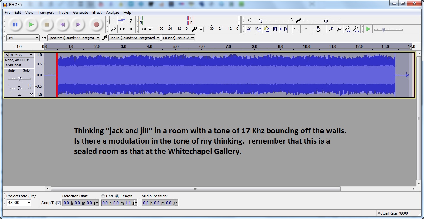 Above is the tonal modulation of the thinking process. Try and focus in and find the tone that modulates. Remember that I am just a penny investigator, an artist who is researching for an interactive installation. When this system is well designed with filters to isolate the modulations and to amplify them further and adding an algorithm to it to make clear speech out of recording the thinking process. I think this is possible. Even in this rudimentary rough cut you can make sense of what one is thinking. The sealed room at the whitechapel gallery has created the perfect conditions for listening to the thinking process – a tonal frequency in the air, created possibly by a fan in a building closeby, all quiet because this is a gallery, thinking of art – what are you thinking. You can just ding dong about speaking – because speaking will be easily heard ANYWHERE the tone is present but still connected to the sealed room. All is connected as the tone will make its way through the crevices into adjoining buildings and as long as the tone are not distorted from its journey your thinking and speech will be embedded in the modulating tone. This is really like the Doppler effect where a cop tries to find the speed of a car on the highway. The radar gun uses microwaves, here it is just a simple tone sent out, being modulated and monitored on its return journey – Doppler.