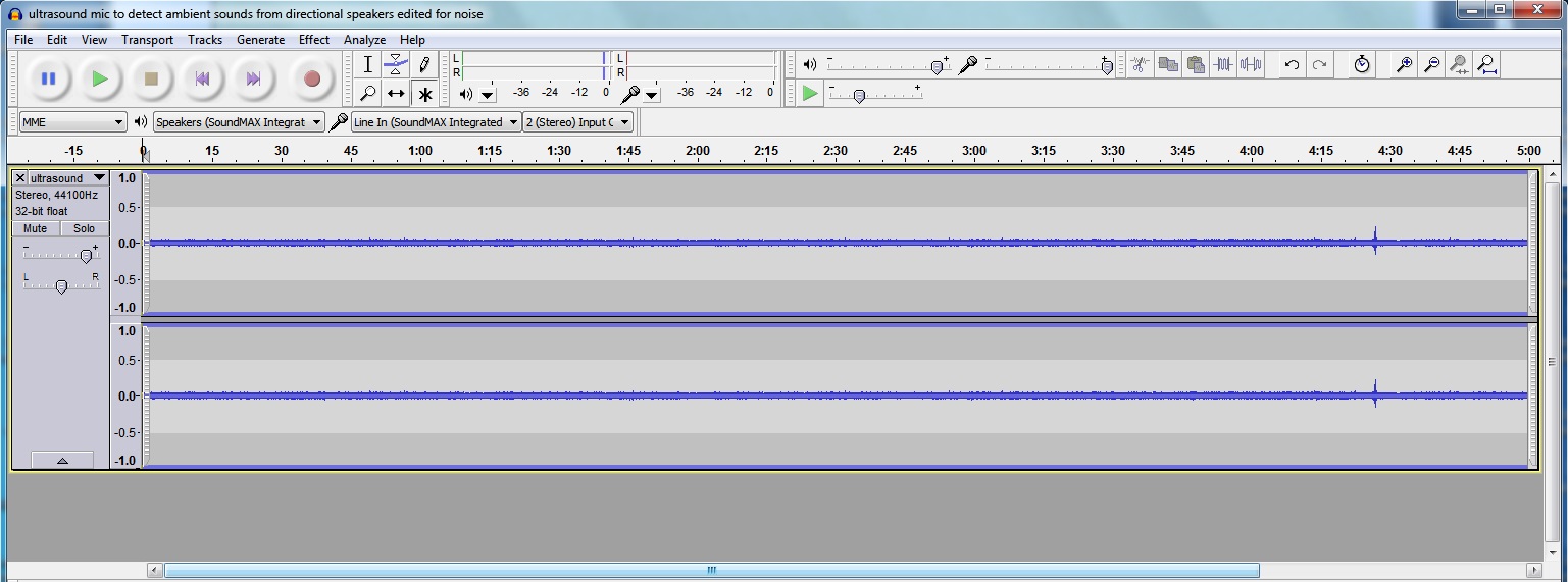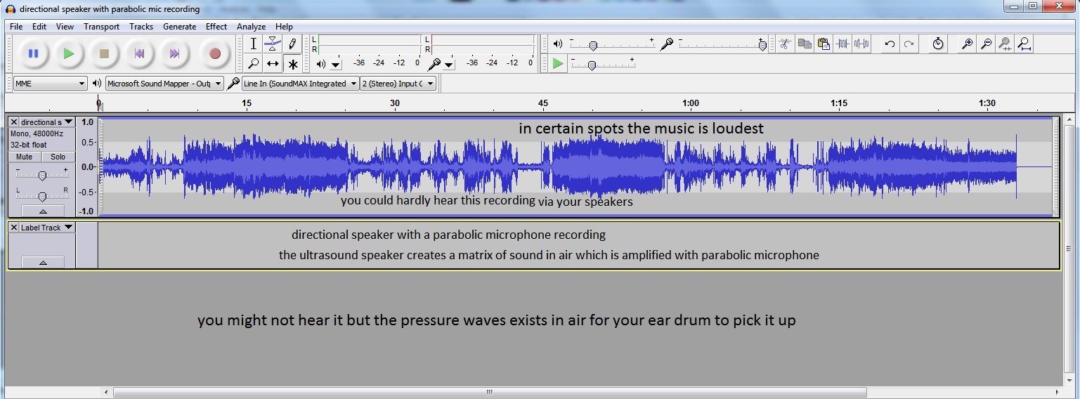You can see with the recording above that the music is accompanied with a tone. As I have noted above this is why with these type of shenanigance you get a high level of tinnitus in your ears but there is one important aspect to this tone. It will show you clearly how the canopy of ultrasound emitted by the speaker is created in a room. This recording below was made using the parabolic microphone.