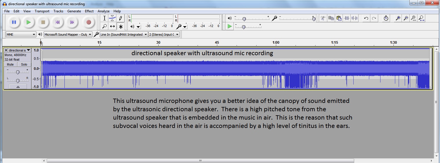 With the advent of ultrasound gadgets firstly for imaging purposes but now has found a new place to exists and this time for more sinister reasons. It is good at creating sound clouds in the air and can chatter along in sub vocal tones not being heard by the ear but still processed through the ear drum and they act as good subliminals. It is all a matter of how the sound cloud is designed using modulated ultrasound. In this example below I played a text out through ultrasound speakers and keeping the volume on the threshold of just being audible while using an parabolic microphone to record it. It is not audible with normal hearing. You have to use in-ear or normal headphones to appreciate this recording. Of course the audio projection could have been louder and heard by the ear, but this was not the purpose of this example. A just audible example of this projection can spook the listener as the words are projected into the air and seeming not to have a source – such is how ultrasound speakers are designed.