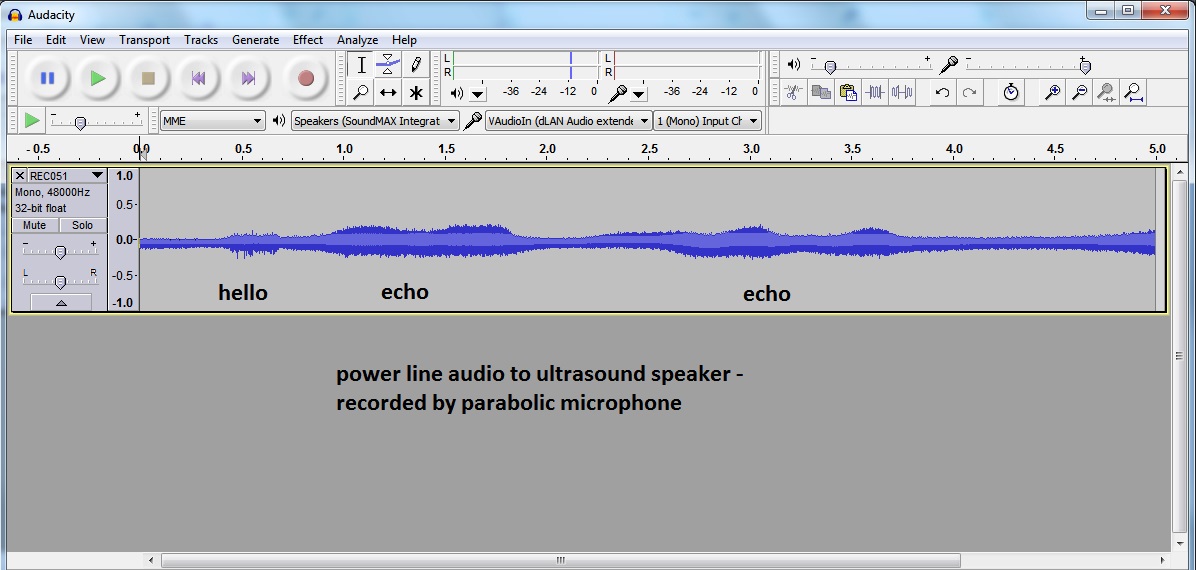 This below was recorded in the air by a parabolic microphone. Perhaps it shows the echo of the spoken word better when projected by an ultrasound speaker probably because of of the signals bouncing of walls or even maybe due to the way the signals travel via the powerline. Words can linger on in the air through echo’s and not heard by you but will be processed by the ear and the brain to create an impression.