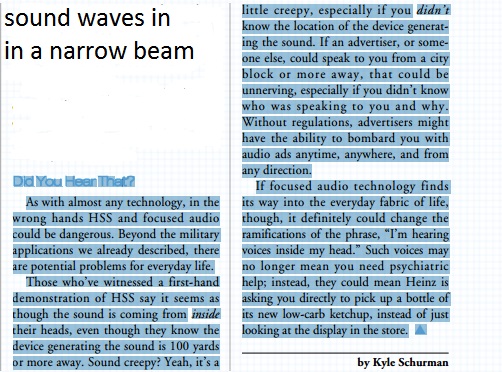 Not many on the net who will speak of the down side of this phenomena. Below is one of them. ” As with almost any technology, in the wrong hands HSS and focused audio could be dangerous. ….there are potential problems for everyday life” Please also look at the link for this extract below for a good explanation on directional sound using ultrasound.