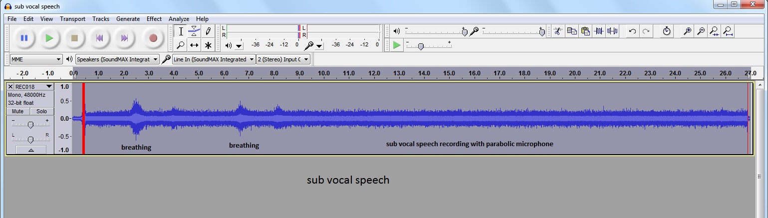 Sub vocal speech is that where you silently speak when you think. You are wired that way. Now if you can monitor this sub vocal speech then one can know what you are thinking. The design of the parabolic microphone is such that it keeps the noise level of the recording to a very low level. So to demonstrate that sub vocal speech can be captured this would be a good microphone to use. I have used a relatively cheap parabolic microphone and recorded my inner sounds to demonstrate this phenomena. If you were looking at me you would not have thought that I was saying anything. You will notice how easily it is to hear your breathing and i was “thinking” “jack and jill……….” silently. “Speak Thinking” has been a favourite interest of mine. If another can know what I am thinking then what else is there?