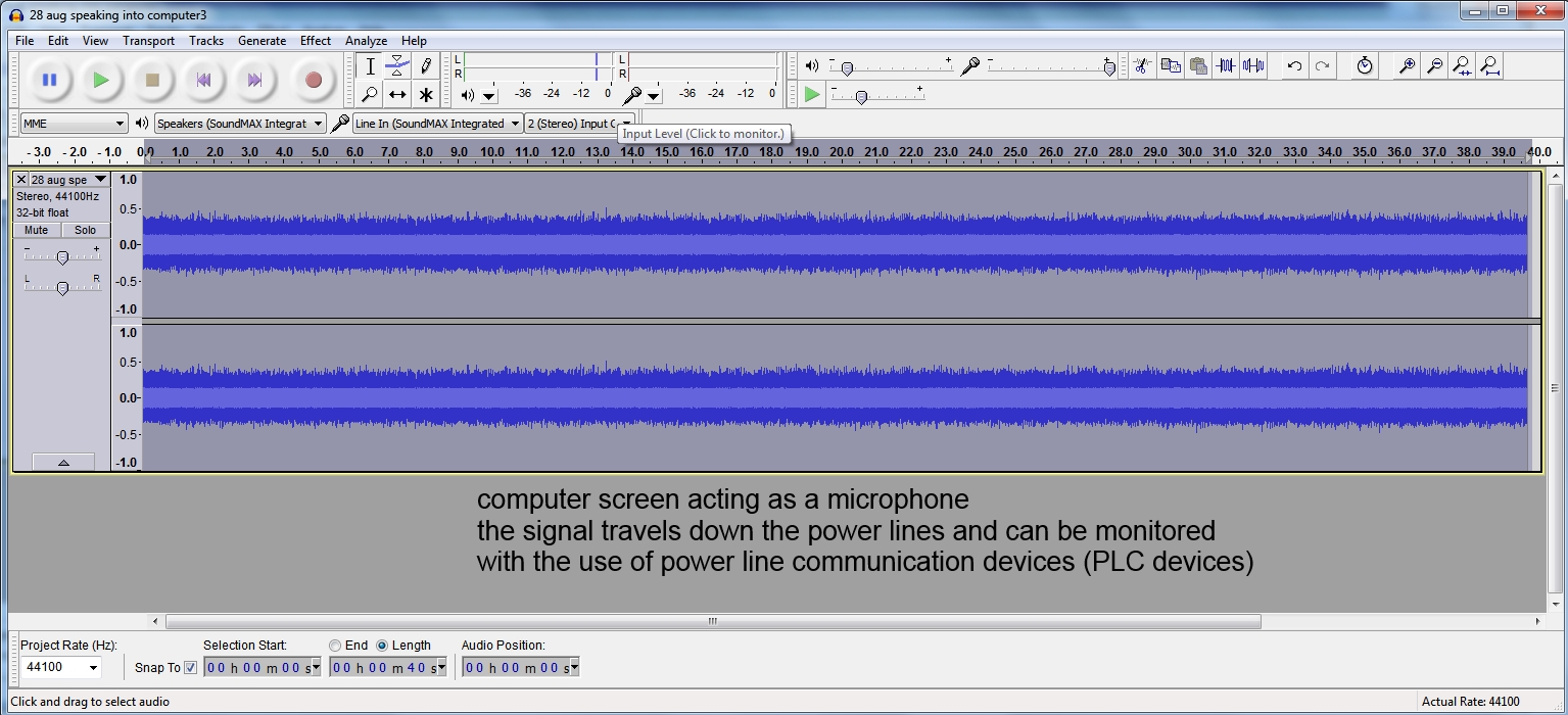 It is exactly as it says above – accessing voice in your home including sub vocal murmurs (and hence your thinking as you silently speak when you are thinking – “speak Thinking”) and distribution to the rest of the city and stored in data centres. The information goes through your household power lines – the Power Line Communication network – PLC network. This information can be intercepted by the many PLC gadgets that you can buy these days. The technology I gather has been studied for a while but matured in the last 10 years or so. So it is fairly new. Apart from the power lines in your home you must remember that the space around you will be filled with electromagnetic radiation from the lines. (an em meter will show you some em radiation in the air). Also your TV and all the other gadgets in your home will be emitting EM energy. Your household space EM waves and your power lines are hence connected. You computer and all your gadgets in your homes are connected to the mains as they are plugged into your wall sockets. You are in the middle of all of this – and connected to the mains as a result through these EM waves in the air in your home. So you can see the big picture – all is one with the power lines and through all the homes in the city to the main sub station as in the diagram above. You are right there in the centre of this. If all this is true I thought – I should be able to talk to my computer and get a signal back through one of the sockets. I should be able to connect a socket to the mains with only the ground cable connected, run it through an induction loop system and the receiver signal back to the computer for monitoring. All set up I talked into the computer, first “jack and jill” then counting 1 to about 20 to see if the signal returns to the computer through the power lines. (Please do not play with the mains unless you know to play safe). These are the results: Not much to see here in terms of modulation but the information is embedded in the buzz of the signal.