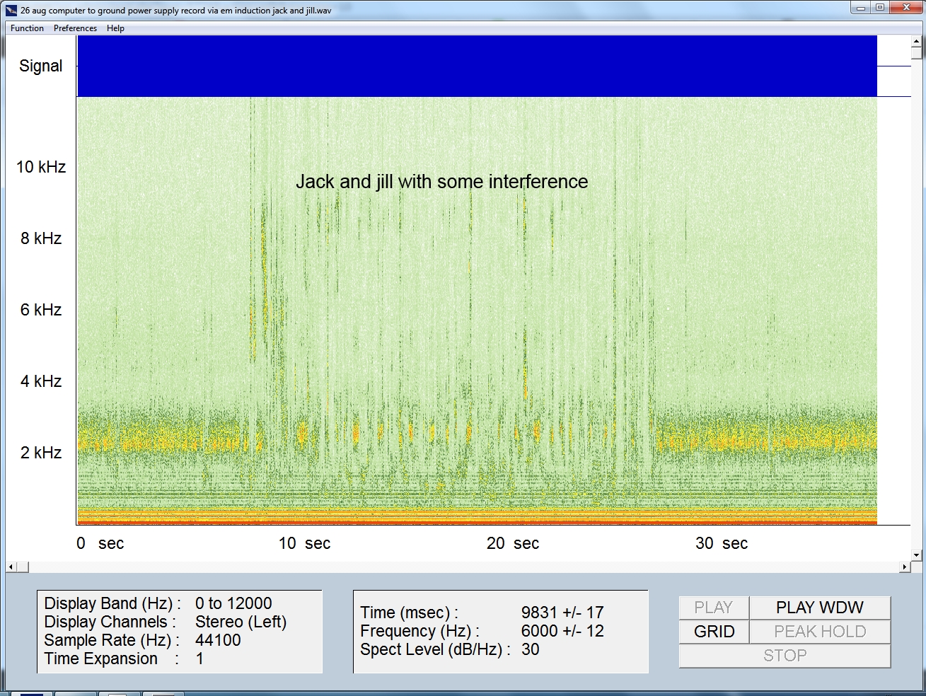 So I tried this: Connected 2 plugs to transmit sound (Billie Jean) down the ground of mains power supply and the other to pick up the ground signal from the mains. This is what I got:
