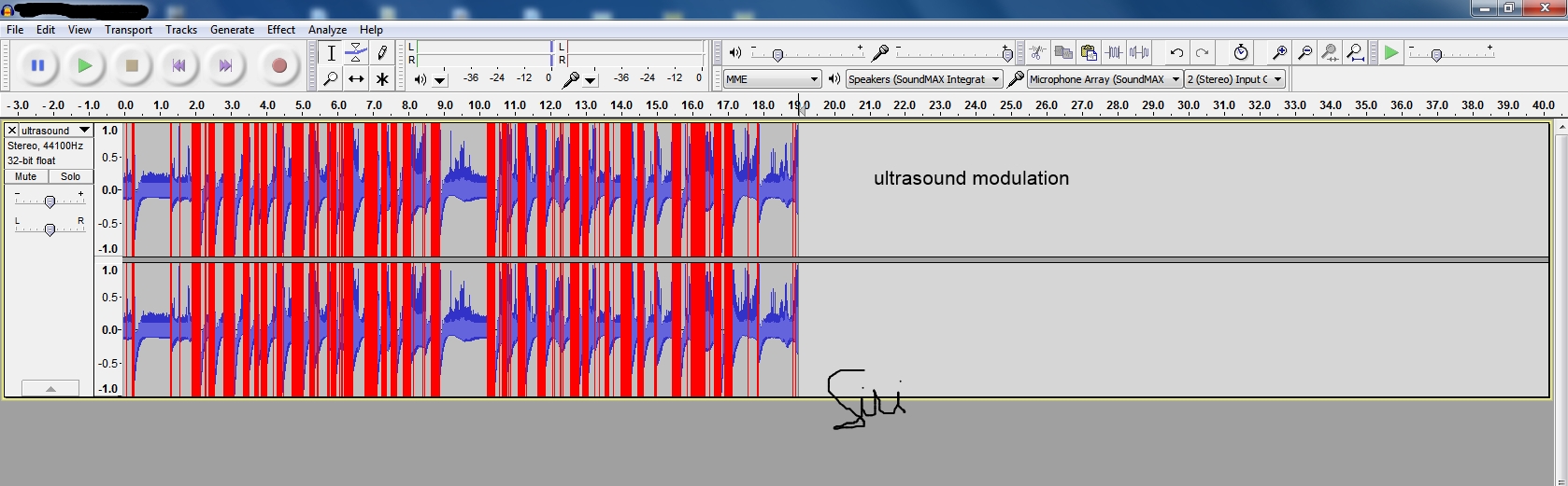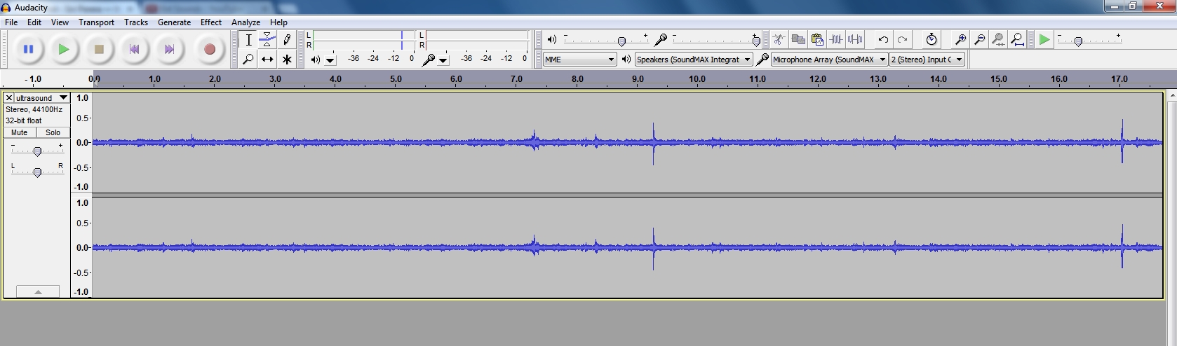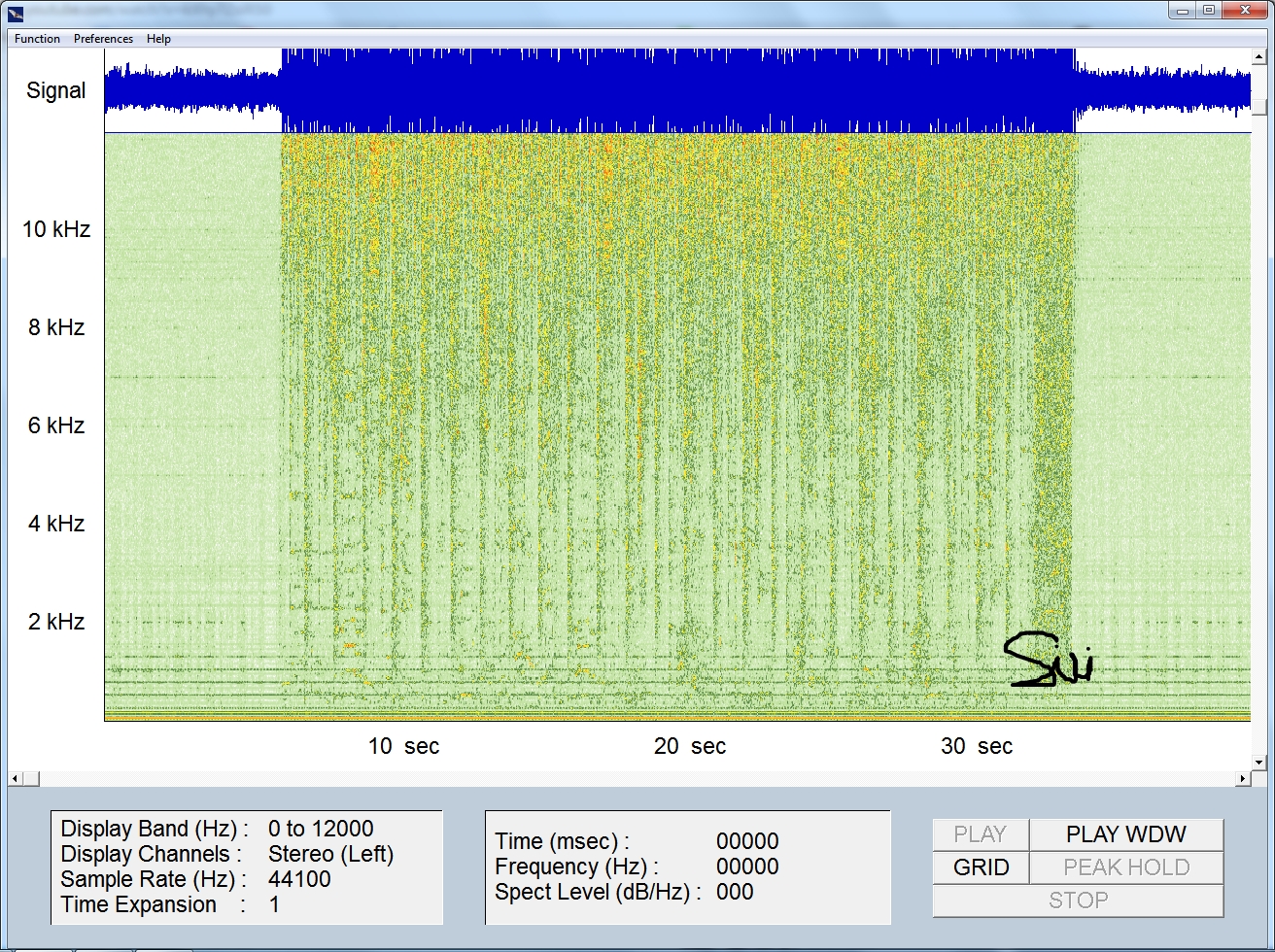 ( I must point out here that according to the literature for the mic, the 6 Khz base frequency you see above is actually 60 Khz ultrasound signal as the recording has been stepped down by the software so we can hear the sound. The human hearing range is from 20 Hz to 20 Khz.).