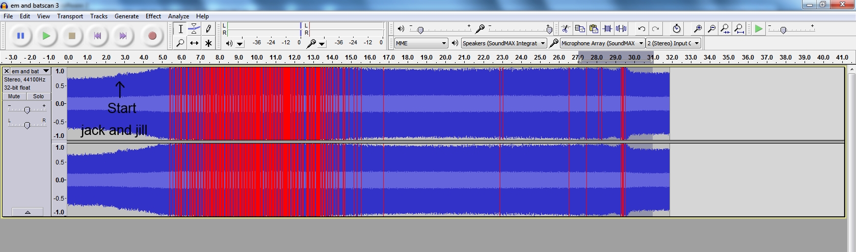 Electromagnetic induction loop using ultrasound software. Here it is the algorithm that matters as to how it interprets the signal. Remember the final input signal is always electrical via an em induction pickup. The ultrasound microphone does the same, the microphone picks up sound and creates an electrical signal to be fed into the software for processing. The software has an algorithm designed to process a specific type of signal: sound or an em signal but the electrical signal generated is specific to its sensor. The algorithm will processes either as all it needs is an electrical signal. Here an em loop receiver against an in-ear headphone picking up sub vocal murmur. I hardly but silently recited “jack and jill” under my breath. If you looked at me you would have thought that I was just staring into space but there was a gentle murmur in my breath. results: The result of the scan was transferred to audacity to create an MP3 file. The MP3 file is an original with no editing.