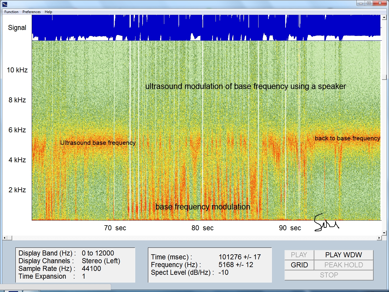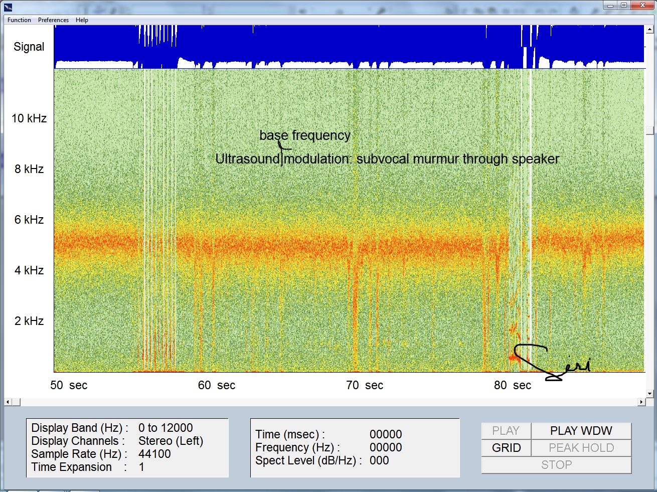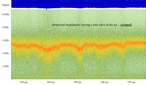 The recording below was done with an ultrasound microphone. The scale goes from 20 Khz to about 200 Khz. I have mentioned above the standard 50/60 Khz hum ultrasound? In this example I projected into the air a 22Khz frequency tone and also some words from a text. Then I recorded this with the ultrasound microphone. You can see it all below. You can see how the recording shifted down to 22 Khz (should be 2.2 khz) on the plot. This say a few things: