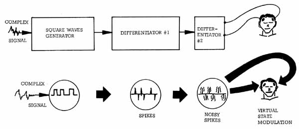 “When these time spikes are then introduced across the body as pulsed voltages, they are modulated directly on the dendrite firings of the brain and nervous system, providing direct and pulsed modulation of the neutrinic and mindfield component channels of the mind-brain-consciousness-life loop itself. Thus the neurophone directly inputs information into the brain and nervous system, bypassing all the normal sensory systems that lie between the mind-brain loop and the outside environment.” (http://www.cheniere.org/books/excalibur/neurophone.htm)