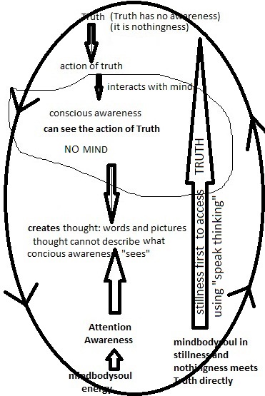 Jiddu Krishnamurti in a conversation with David Bohm, a Phycist’s, also discussed this: I made a picture of this conversation too: When one is at the no-mind state conscious awareness can “see” the action of Truth. All that comes out of the repository of the Truth of things which is a fact and true, a trusted observation that can be used. It is not what comes out of verbal thinking (or “speak thinking”) which are spinners of facts of the Truth which turn them into a lie in you or an illusion in you. The facts of Truth can only show themselves when the mind is quiet and not when the mind is rattling away with verbal thinking.