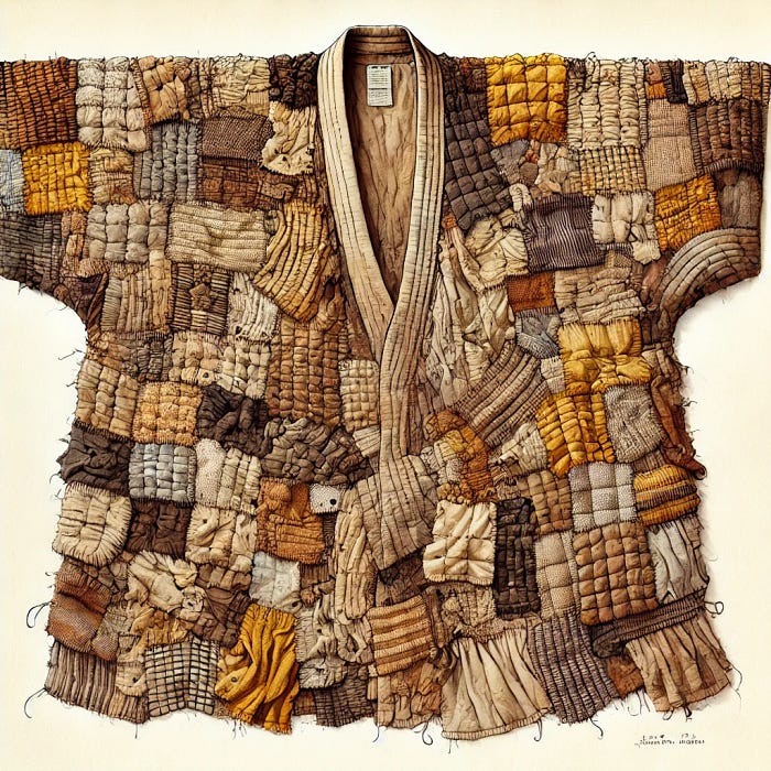 Kasaya originates from the Buddhist tradition, referring to the robes worn by monks and nuns. These robes are traditionally made from discarded pieces of cloth stitched together, dyed in earthy hues like saffron, ochre, or brown. The patchwork nature of the robes symbolizes simplicity, detachment, and renunciation, reflecting the Buddhist ideals of humility and non-attachment to material possessions. The word itself is derived from Sanskrit, where “Kasaya” means “impure” or “soiled,” signifying the rejection of luxury and worldly desires. In Buddhist philosophy, the Kasaya robe serves as both a practical garment and a profound metaphor for the unity of fragmented elements, symbolizing the path toward spiritual wholeness. This foundational idea of stitching together disparate parts to create a harmonious whole serves as a powerful inspiration for broader interpretations in art and philosophy.