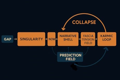To visualize this, envision a dynamic flowchart: Starting from a GAP of emptiness, it surges into a SINGULARITY of integration, blooming into the NOW. A NARRATIVE SHELL encases it, followed by the FASCIA TENSION FIELD of embodied feel. The KARMIC LOOP curves back, feeding the PREDICTION FIELD, all culminating in the overarching COLLAPSE that resets the wheel.