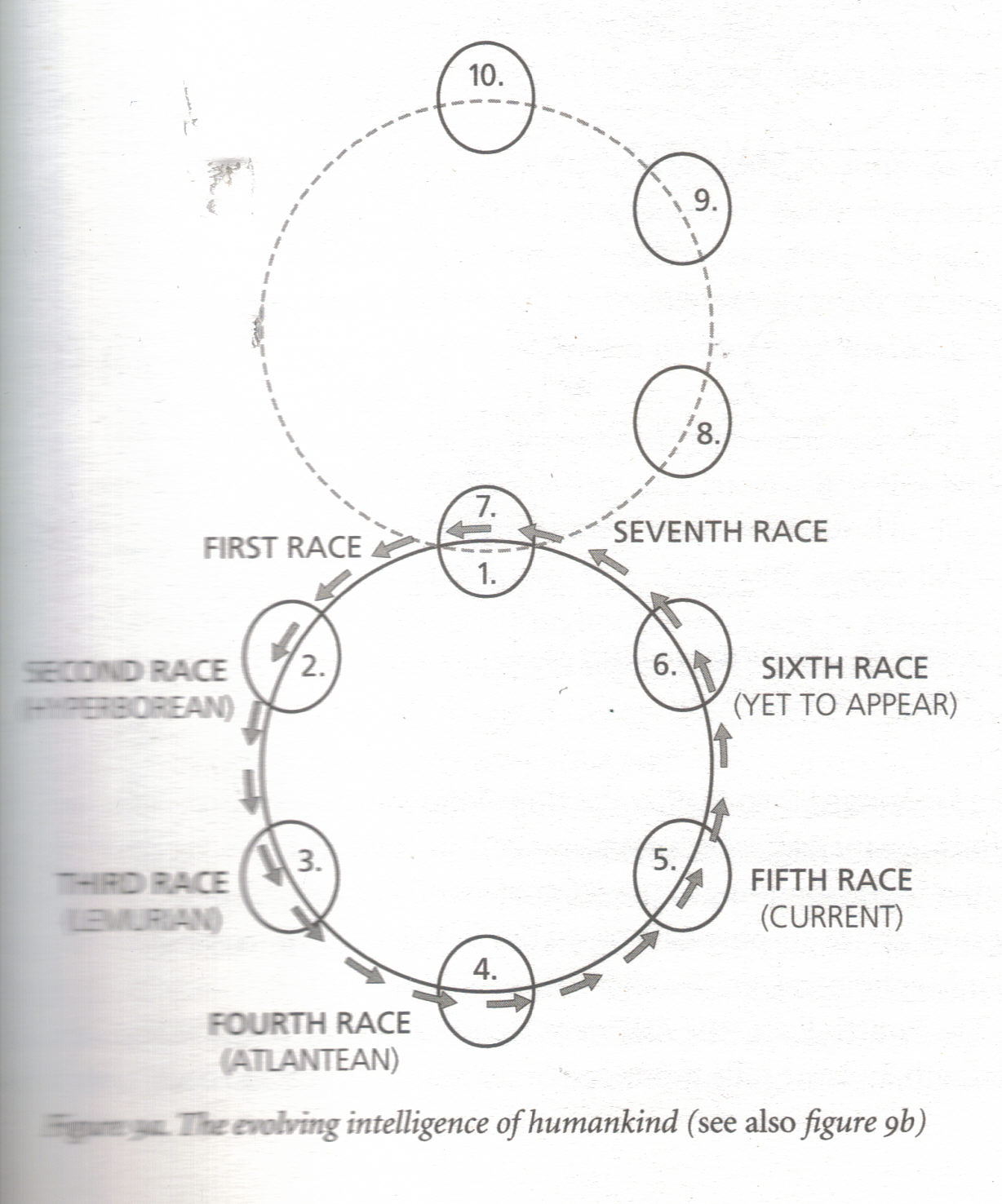 History of the universe has been a cycle of chaos and order. The making of us and the destroying of us: order and chaos. Atlantis was an example of this. In this cataclysm the new is created. As in art, it is only the look for the NEW is relevant. It is a personal opinion. It is the driving force for the unfolding of the race and evolution. ‘…..The ancients saw consciousness unfolding and then evolving……’ (‘The rise and Fall of Atlantis’). To bring this to a close quickly it is sufficient to say, from looking at J.S Gordon’s work on Atlantis, that these cyclical nature of the universe would bring on a series of states or ‘planes’ of consciousness within our local solar universe, that little circle in the center of the diagram. We evolve through 7 planes of consciousness (The current race is 5 and on the 5th plane). The flavour of this evolving nature of the races is one of involution becoming more egocentric, with increasing amounts of mass desire and by the 3rd race more grounded increasingly in physical matter. By the 4th race the concept of Mind, desire and physical form is fully integrated. ‘From the middle point of this race (4th) the process of evolution commences, the desire principle now becoming increasingly personalized and dominant in each individual and each local group. Correspondingly, in the present Fifth Race, it is the mind principle which is becoming increasingly individualized and dominant in the integrated personality and the local group.’ The seventh race returns to the first race and both races are spiritual in nature and the cycle repeats itself. As it did in Atlantis, the catastrophe will bring an end to one form for it to evolve to another. Another diagram from the book on the different races, ‘The Rise and Fall of Atlantis’ by J.S Gordon ISBN: 978-1-905857-43-2)