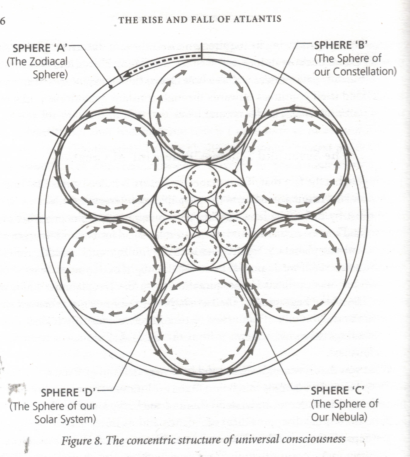 The spark in ones own mind can come from many different places. This is also a component of how the Whole perhaps works. I was at a talk by J.S Gordon on his new book, ‘The Rise and Fall of Atlantis’, but more on some of the reasons for climate change by looking at the history of the formation of the universe, from chaos to order, and an underlying order that is cyclical, yet very precise. This explained the cataclysm that ended Atlantis. And it is here again today. It was by looking at this structure of the universe and its possibilities that the point was made, that perhaps within our galaxy, we live within a sphere of consciousness that is contained, because of the forces that hold the different parts of the universe together (see diagram below).