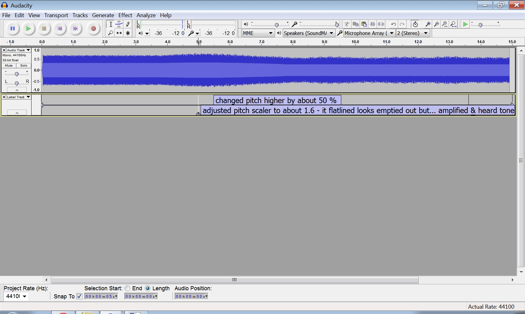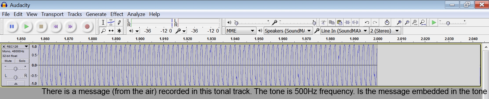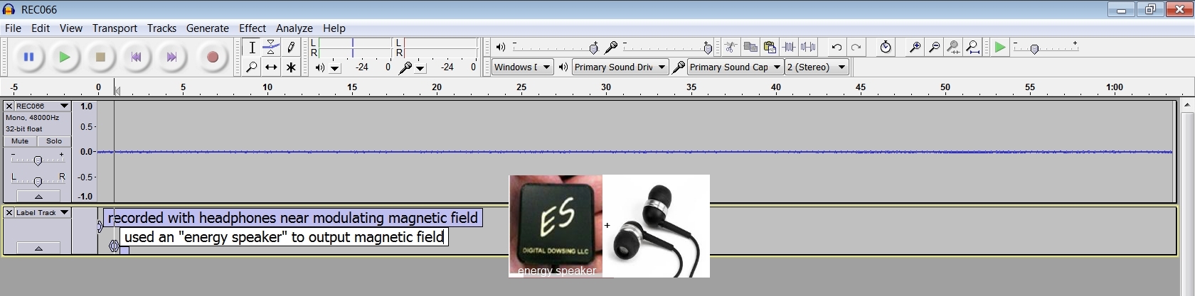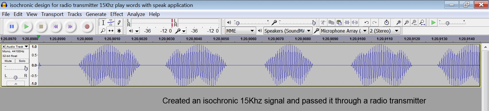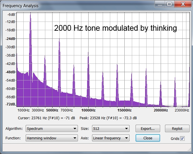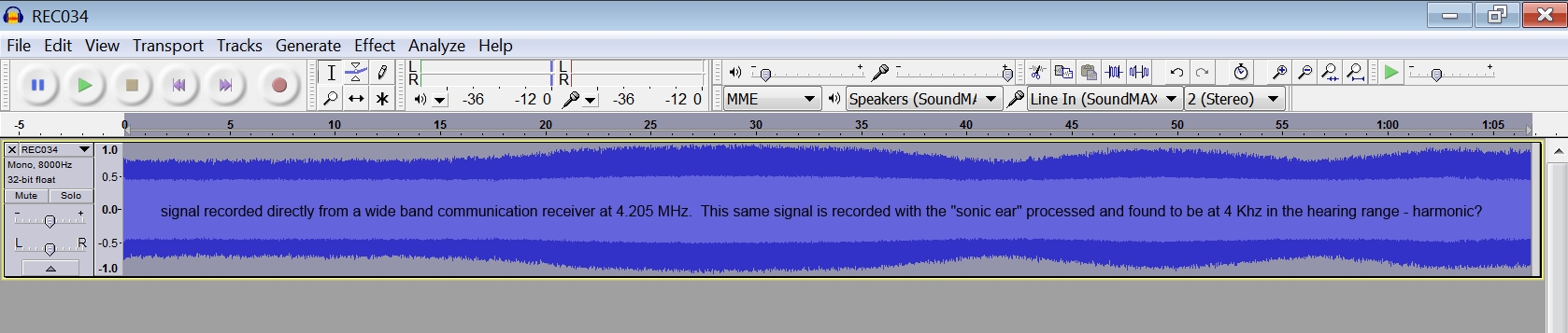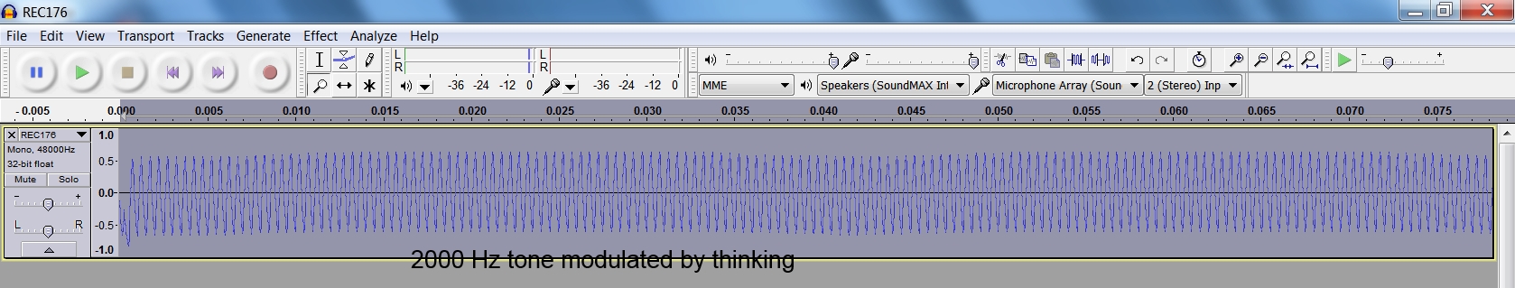 I used a wireless microphone to record this experiment. I found this one by chance.  It had a base transmitter that is connected to the computer. I played a tone: 2000Hz and the tone was transmitted from the base to my headphones. No wires between me/headphone and the base transmitter. I though to myself – the wonders of technology, just like that. But as I was thinking this I heard the tone being modulated to reflect my thoughts and it was doing really well with no interference. I looked at my headphones and it had a record jack. So I connected my recorder and did a jack and jill and only thinking it and I could feel myself silently reflecting it in a very gentle murmur and hear the tone being modulated. So I recorded the whole episode and the results below.