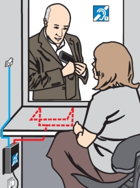 1 in diagram – sound into a microphone generates an electrical signal                                2- the amplifier increases the electrical signal                                                                         3- The amp passes the signal into a loop of wire which then radiates a magnetic field around the room containing the sound signal.                                                                        4 & 5 – the listeners wearing the hearing aid has a                                                               6-telecoil built into the listening device. This picks up the modulating magnetic field and converts it back to an electrical signal which generates sound via a speaker and heard by the ear.