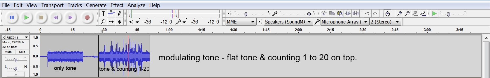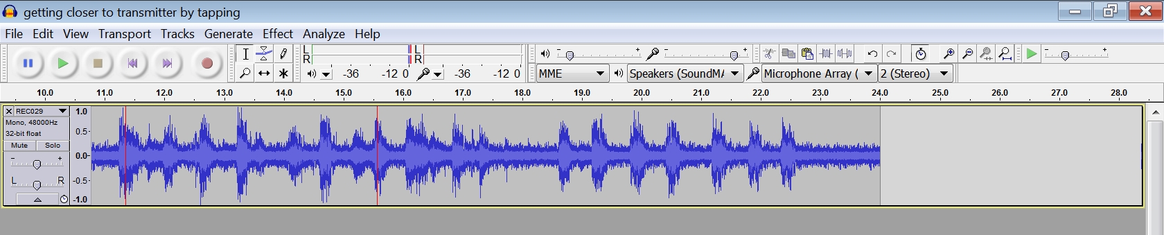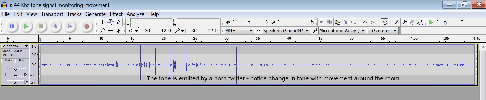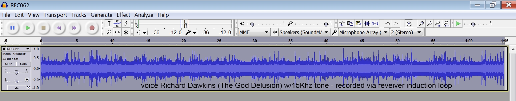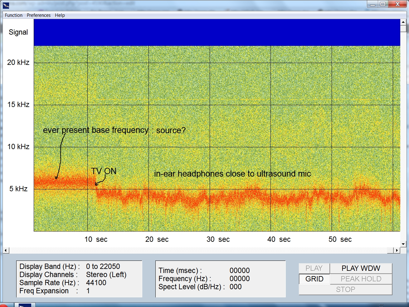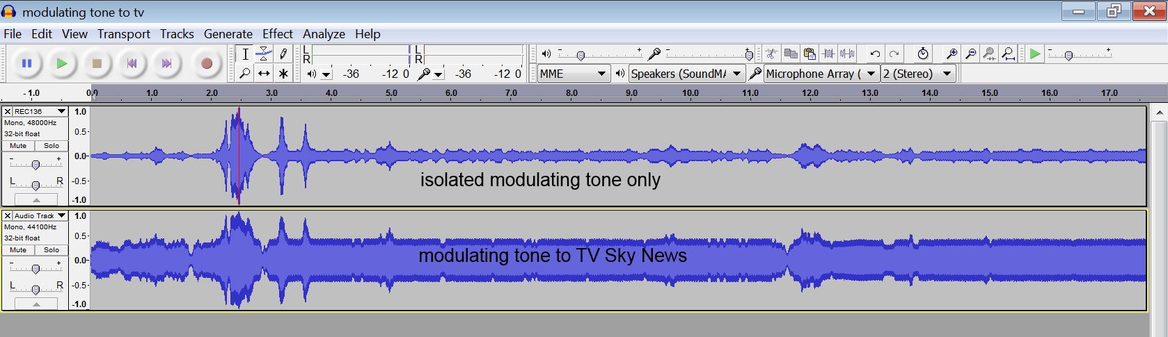 It obviously is also picked up by the microphone too but as you can hear and see the signal is much weaker.  I want to put it to you that in the previous recording the recorded signal is of both what is picked up by the microphone and what is picked up via bone conduction hence the signal being louder. In all of this I want to remind you that the tinnitus noise in your ear increases when a signal is being transmitted near you.