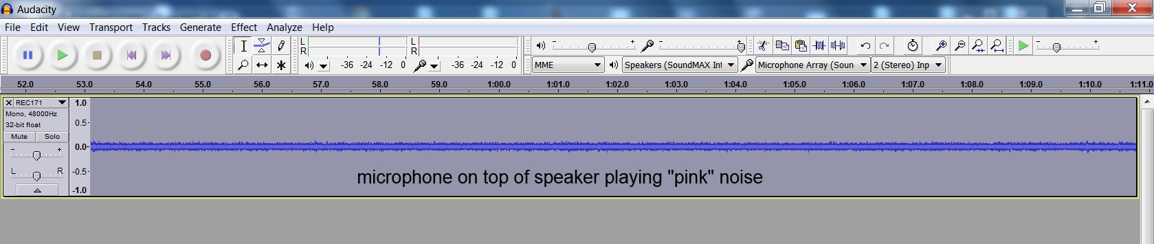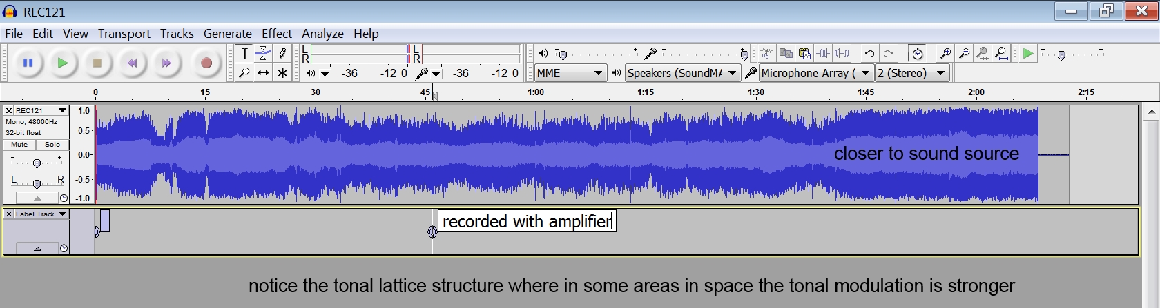 Below is an example where I played a sound of “pink noise” over the computer speakers and then just silently murmur over the tone, no sound and also recorded it simultaneously.  The murmur will create a pressure wave over the tone. You can see how clearly pink noise will modulate over another pressure wave. Pink noise is where all the “sounds” within it has equal “power”, hence it is a well balanced equally distributed sound pressure wave, so when it is modulated it will be clearly visible? or rather it will reflect an interference well and be moulded accordingly. Like sculpture: moulding an object in wax/plaster to be turned into an exact replication in bronze.