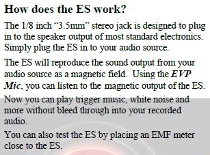 The energy speaker generates a magnetic field and if you plug it into a recording of a  lecture it will generate a modulating magnetic field of that recording. Then if you treat your in-ear headphones as microphones and place it near the modulating magnetic field connector to a recorder, it will record whatever that magnetic field is saying.  So if at times you are listening to music, all peace an quiet, cool like, in a daydream of your own with your bestest in-ear headset, and you hear: “hey jackass”, you say, “what, who said that”??**? and you turn around too see where it came from: don’t blame the person behind you – it could have come from the ether.
