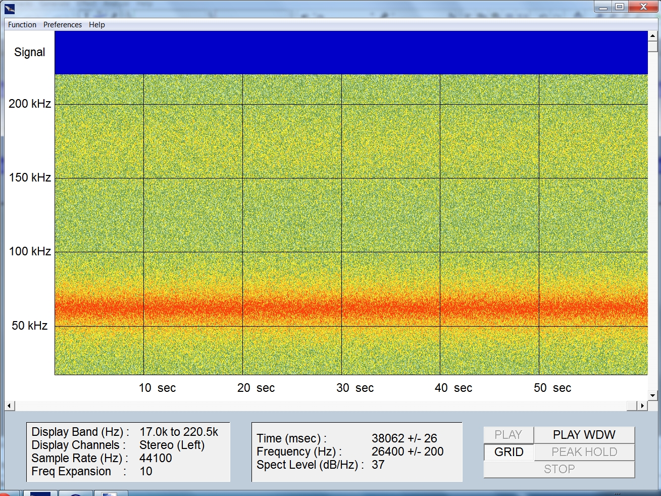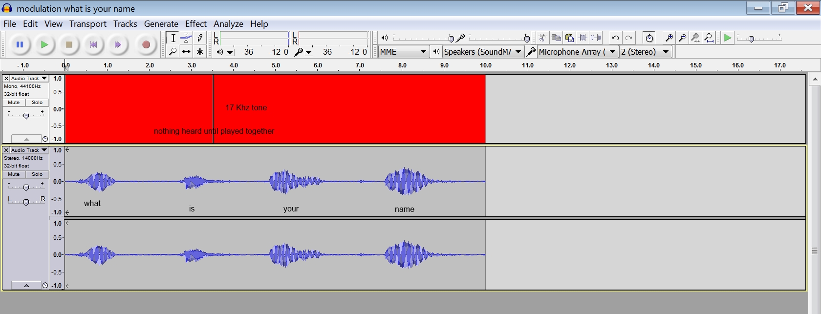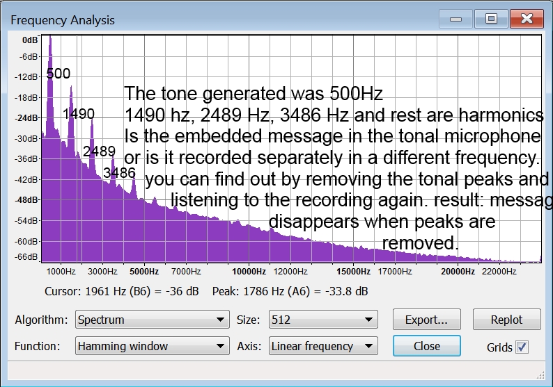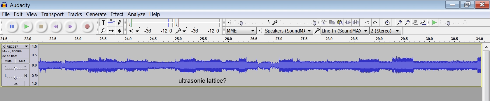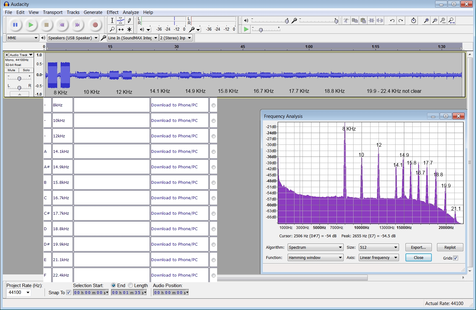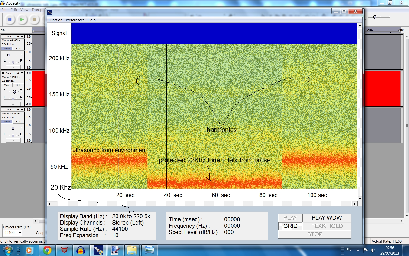 We now leave the  electromagnetic wave (with electrical and magnetic components) and concentrate on sound a pressure wave. The ear  is designed to detect pressure waves  (a sonic boom). With sound it is easier to get into the mind of a person because one has a sensor specially designed to detect sound. There is no jingle jangle with sound – it gets through or not. But can sound get through and you not know it and hence alter your thinking and hence your perception.  This experiment is about that.  So you look at the results of the experiment below. The following tones below were played to a piezoelectric speaker (vibrates according to tone) and recorded via a table top microphone that picks up vibrations and converts them back to sound. When I played the recording back and listened to them through in-ear headphones I could hear all the lower frequencies but not those from 19.9 KHz to 22.4 KHz.  I gather most tenagers below 20 years could hear all frequencies.  Notice also below that the volume of the tone also gets lower with the higher frequencies. So if you want to send a pressure sound wave to somebody so he will only just hear it or not “hear it” but still get through to his brain and get processed, then you want to concentrate on possibly the frequencies from 14.1 and higher and if you want to spook somebody and hear just some sound but not know where it is coming from you would just adjust the volume.