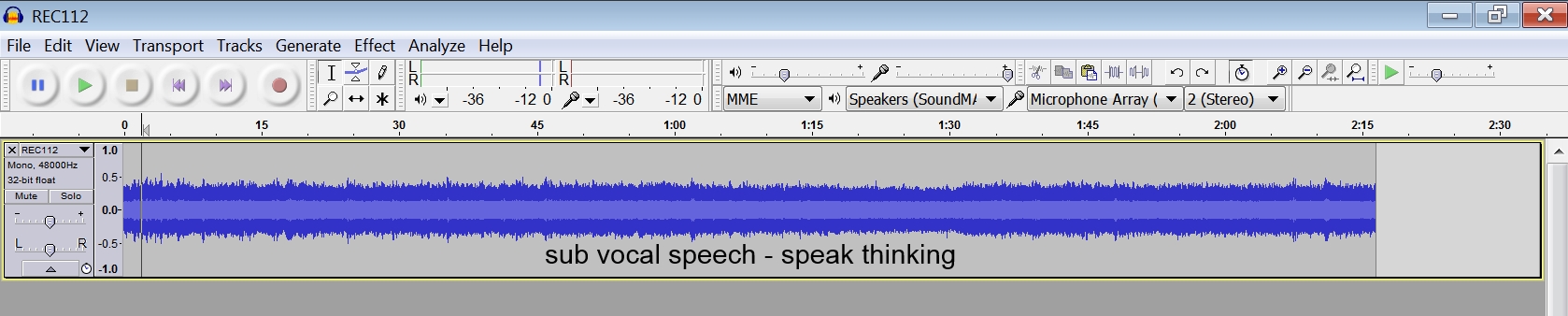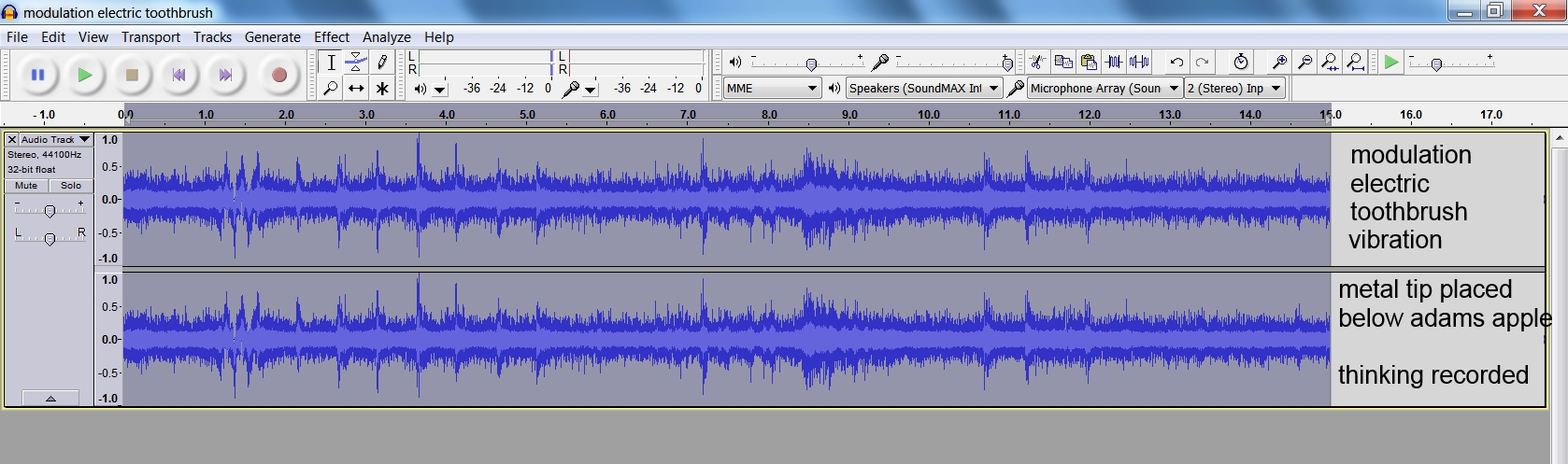 I don’t know if you have noticed that when you are brushing your teeth you can actually hear your thinking in the sound of the tooth brushing process in your head, through your ears. This example below is using an electric toothbrush, remove the brushing tip and place the metal protrusion below your adams apple on your neck where your vocal cord would be located.  Start the motor and think aloud, that is silently murmur (no sound) what you are thinking as you normally do when thinking.  The results below: