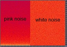 (Pink noise (left) and white noise (right) on an FFT spectrogram with linear frequency vertical axis –  wiki http://en.wikipedia.org/wiki/Pink_noise )