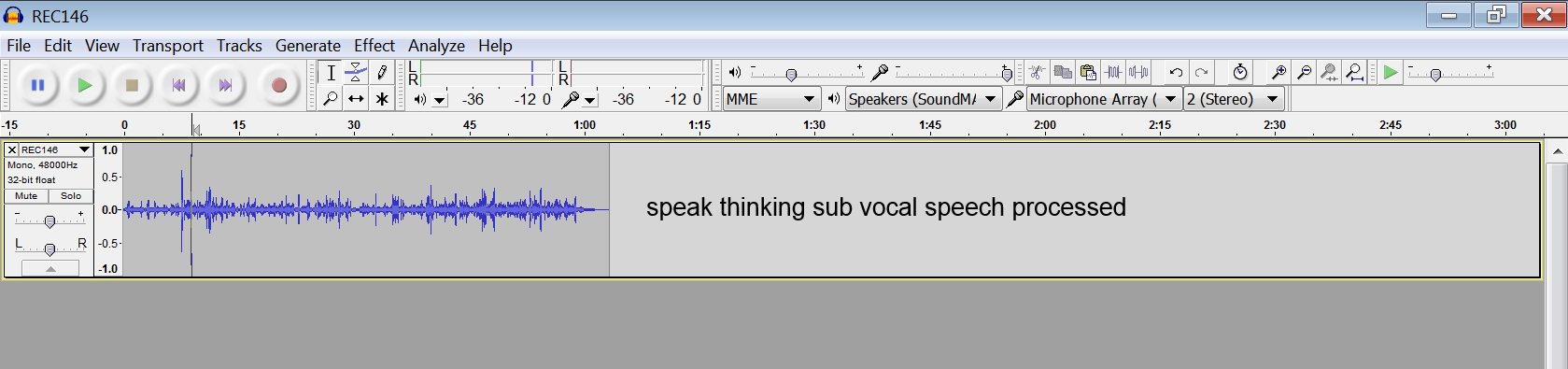 So the finalest on “speak thinking” is this: it is a background tone that permeates space.  It could be an unheard ultrasound tone or a gentle under the hearing threshold that is slightly audible. The tone must be clean and smooth so when it is modulated by “speak thinking” it is easily decoded.  This tone that permeates the air around you is easily modulated by another pressure wave.  The pressure wave need not be loud enough to be heard. In silent “speak thinking” where you silently speak what you think is sufficient to modulate a tone in the air. This modulated tone can be recorded to reflect exactly what you are thinking.