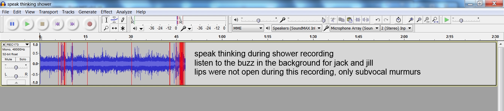 With the recordings above you have to listen to the buzz for a modulation of my subvocal murmurs using the “white noise” of the water during the shower. The microphone was in my outer ear. Hence it is recording of the modulation of the tone of my body sound by my subvocal speech (jack and jill) during a shower.  The sound of water over my body and through my ears would create a sound in my body.  This is then modulated by my subvocal speech and this can be heard. This is significant to understanding the possibility of “Speak Thinking”, that is one knowing what the other is thinking by listening to the sound of the thorax and the rest of the body. This tone or vibration in your body will also modulate your breathing. Hence if you listen to your breath you can also hear the sound of your body as your breath will be modulated by this sound.  We have the habit of silently vocalising what we are thinking and this vocalising will be embedded in the sound of the body.    It is similar to if you flood the body with a shower of ultrasound.  The silent sound of ultrasound will modulate to your subvocal murmurs and can be picked up with more sophisticated equipment and demodulated for clear speech.  It also works backwards: the body as a hollow container that will generate a tone within itself of an ultrasound subliminal or just a tone within the hearing range and this will get picked up by the brain. That is why when we become susceptable to external tones we hear an increase to a modulating tinnitus sound in our ears and this modulating will create a modulating tone in the body carrying the subliminal message and the brain will pick it up and make sense of it and it will alter your perception.  The body with no good firewalls is very susceptible to these subliminals. It was designed this way I think so we have this 6th sense of what is happening around us so we can naturally communicate with each other but it is now susceptible to new technological discoveries. If you ask me I think we should have never have gone to the moon as that is how new technologies are discovered and we should never have evolved to being cleverer in what we do, as we began to better understand ourselves and use these new technologies against ourselves.  So now we not only communicate with nature naturally but also with technology unnaturally. So now there are 2 things we can do: we continue playing BINGO like we never went to the moon or we evolve with this new stimulus. As a result the future will be completely different to what we know it to be today: education will be happening 24/7 through the ether, while you are awake and also asleep with your dreams used to instruct you pictorially with adverts in between as subliminals for those who have sponsored your education. Of course you will be completely wired into the space you live in. Privacy? well that is yesterday and will be removed from the dictionary for ever as the concept will be alien to us in the future. If fact we will joke about it in the future: “you know there was a time when we had this thing called privacy, Ha Ha Ha. There was a time we never knew what each other was thinking, Ha Ha Ha. Another round, its on me. Lets try this download from itunes, its really wicked. It’s called Isochronic tones and it makes you want to fly. Ha Ha Ha.” and so the future unfolds and you will be never be the same again as the new in you unfolds.