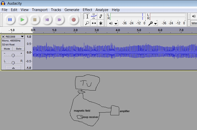 I could create an induction loop from my TV as in the hard-for-hearing induction loops. I passed the signal through an amplifier before sending it back to the TV. I tuned in BBC news. At this stage my hearing would not hear any sound but there should be a modulating magnetic field in the loop. I placed a magnetic field meter in the loop and it had a high reading so this was encouraging.  I placed a loop receiver inside the loop and could hear the news through the loop receiver.  But when I recorded through the loop receiver (records the modulating magnetic signal) the sound was difficult to locate in software “audacity” as it was buried within the noise of the signal but clearly heard through a speaker and this is the mp3 recording below.  If you sit in the centre of the loop see if you can hear the modulating tinnitus sound.  So does a modulating magnetic signal with a message get through to the brain to create an impression or possibly change your perception.  The problem here is that hearing is a pressure thing  that is sound via the ear drums and not a magnetic thing so you cannot locate it in the ear to see if it got through ot not.  Magnetic waves will pass right through your body and our brain and the changes are made there. The influences a transmitted directly to the brain.   TMS – transcranial magnetic stimulation experiments as shown earlier can change brain function, create chaos in the nerve junctions by altering their permeability and hence later the activity of that moment.  MRI (Magnetic Resonance Imaging) scans can allow you to see the internal organs of the body. So why cannot a stream of modulating magnetic “sentence” alter your perception.  Induction loops are now part of the modern world and by law is to be installed in all public places where there is a service to provide to a customer especially to provide for the hard for hearing with a hearing aid. What’s tells you that they are not used to influence you in any way. In shopping centres etc.