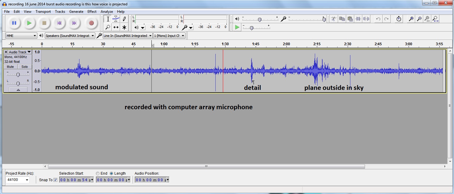 If the chatter was sent via the power line then all the audio gadgets connected to the power line at the time could act as a audio “transmitter” of the subs via the speakers. They are slipped in between whatever is playing in the radio ot tv. In the recordings above the microphone could have picked up the chatter from the speakers itself and they might have come from the power line rather than from the air. I did not hear any of the above except for the plane outside in the sky. In this case being close to the experiment I suspect that it might have come internally. I have experienced where recording that I thought were recorded strangely disappeared when published. I think this was because hacks can via the powerline loop play audio that will play above the actual recording and you get either nothing when played again at a later time or 2 conversation one on top of the other (1 recorded and the other in realtime as you are playing the recording) could seem like garbled conversation making this process of detecting audio subs very difficult.