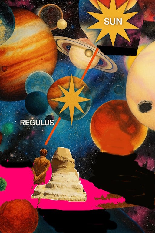 Regulus rising in the Sphinx’s gaze, at this time in history, becomes a mirror of this psychological shift. It symbolises a turning point in how humans understand their own mind. Not a prophecy — a reflection. A sign that the age of spectacle and external power is slowly giving way to the age of inner clarity, where meaning comes from within rather than being externally imposed.
